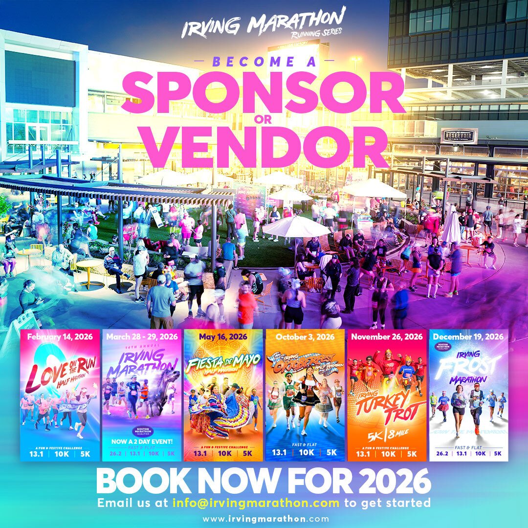 Our events offer multiple distances WELCOME TO ALL FITNESS LEVELS, from a 5k Run/Walk to a Boston marathon qualifier of 26.2 miles. The Irving Marathon in the Spring and Irving Frost Marathon in the Winter are known for their fast, flat, and scenic courses, making them perfect Boston Marathon qualifiers.