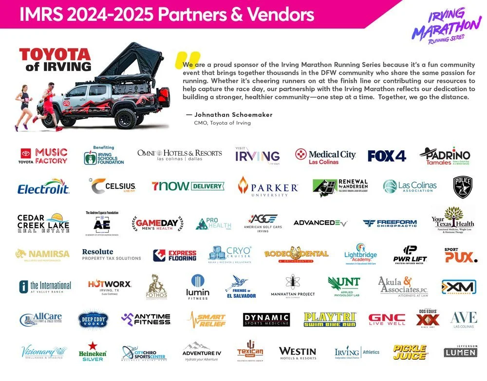 The Irving Marathon Running Series presents the 14th Annual Irving Marathon at Toyota Music Factory! The Irving Marathon is the biggest event in our series where runners from all over the world come together at Toyota Music Factory, America's #1 Concert Venue centrally located in Dallas Fort Worth minutes from the DFW airport.