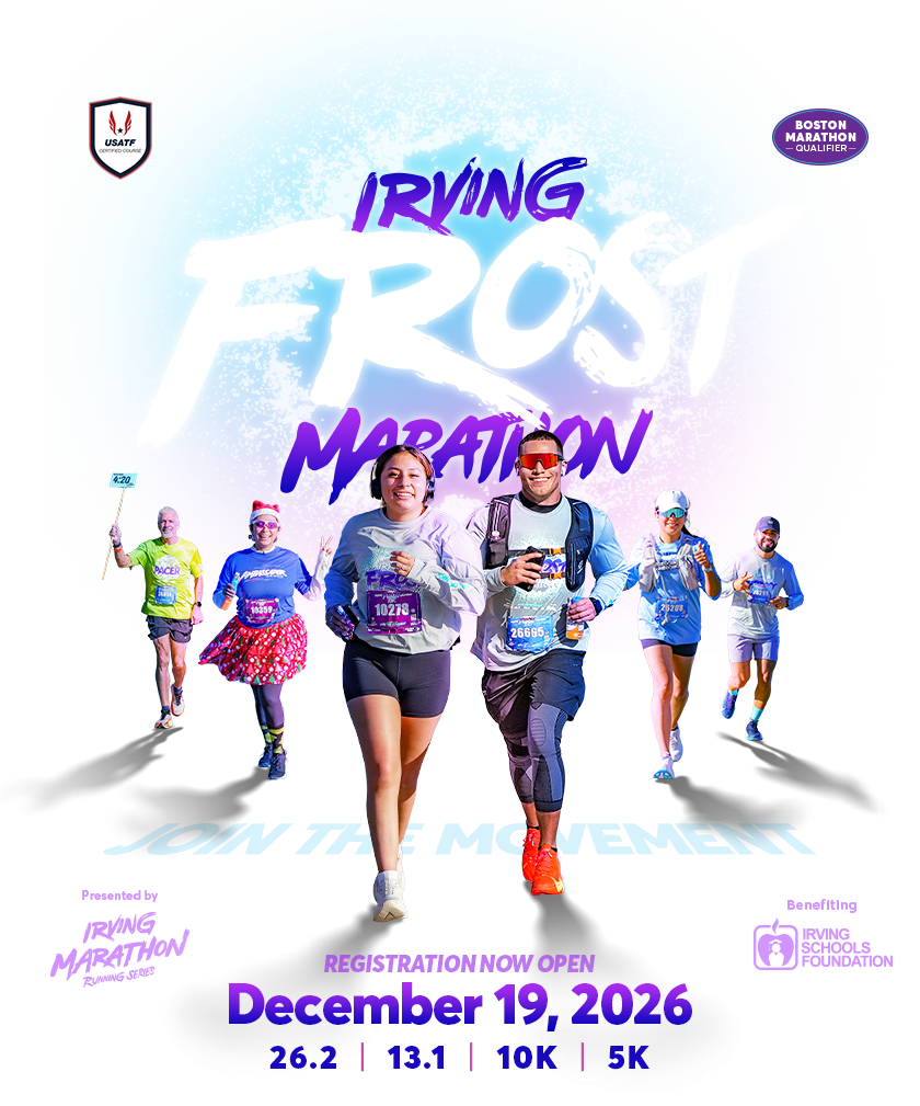 Explore Irving-Las Colinas, with the start and finish line at Toyota Music Factory, America's #1 Concert Venue. All fitness levels are welcome to sign up. Centrally located in Dallas/Fort Worth minutes from the DFW airport. The Irving Frost Marathon is a highly anticipated event with sold-out participation, attracting amateur and professional runners looking to test their abilities.