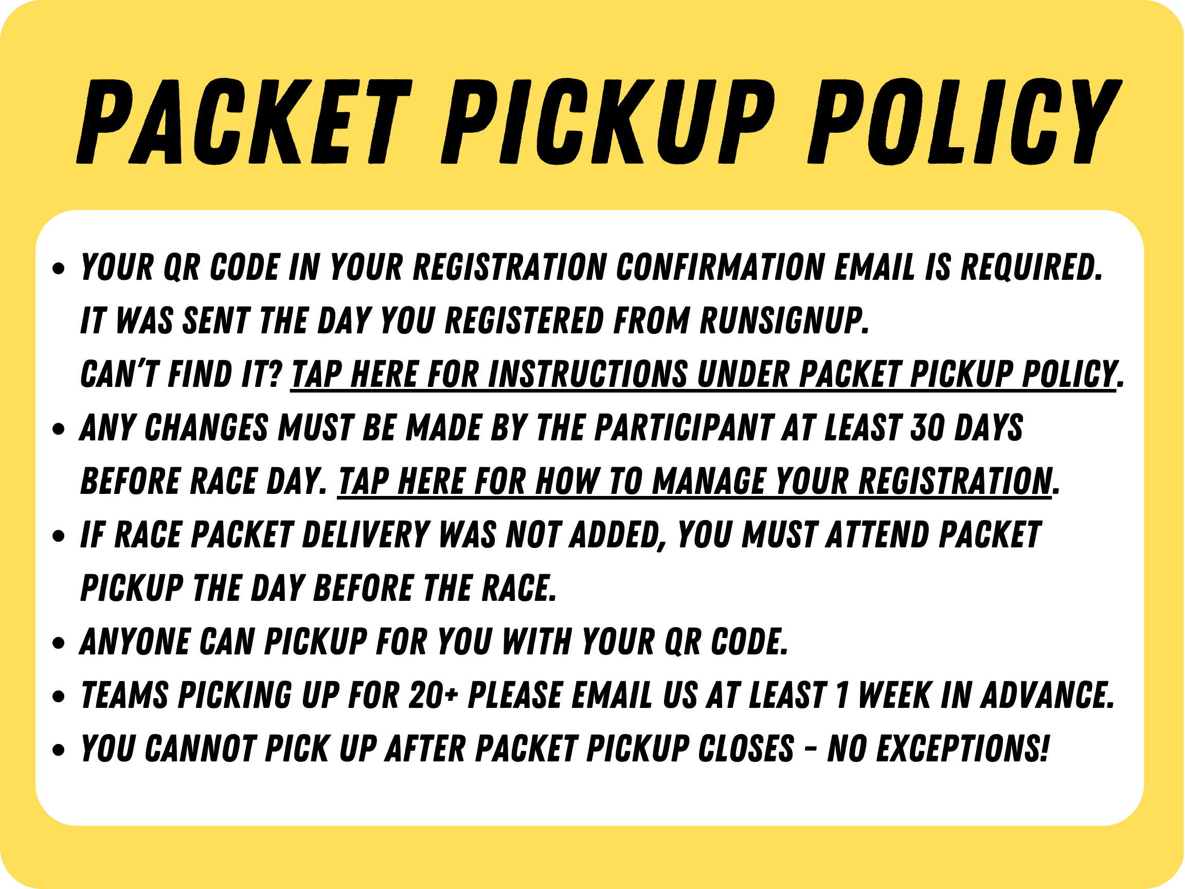 YOU MUST START ON TIME WITH THE DISTANCE YOU REGISTERED FOR OR YOU WILL BE DISQUALIFIED. NO EXCEPTIONS!