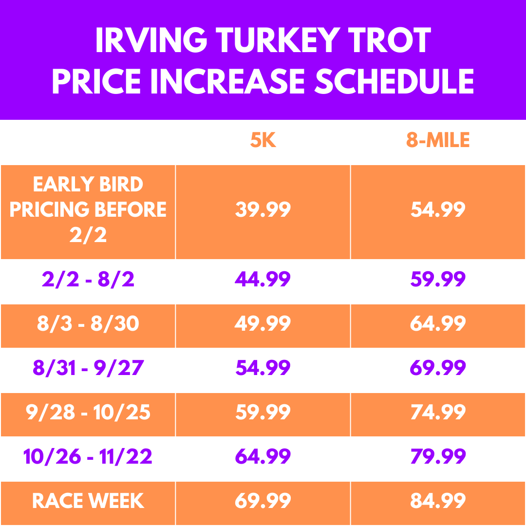 Sign up today to secure your bib, show off your Thanksgiving best (turkey hats, pilgrim tights—we’ve seen it all!), and kick off your holiday with a heart-pounding, memory-making run. Don’t miss out on the perfect blend of fitness, fun, and festive spirit—let’s make this year’s Irving Turkey Trot your new family tradition!