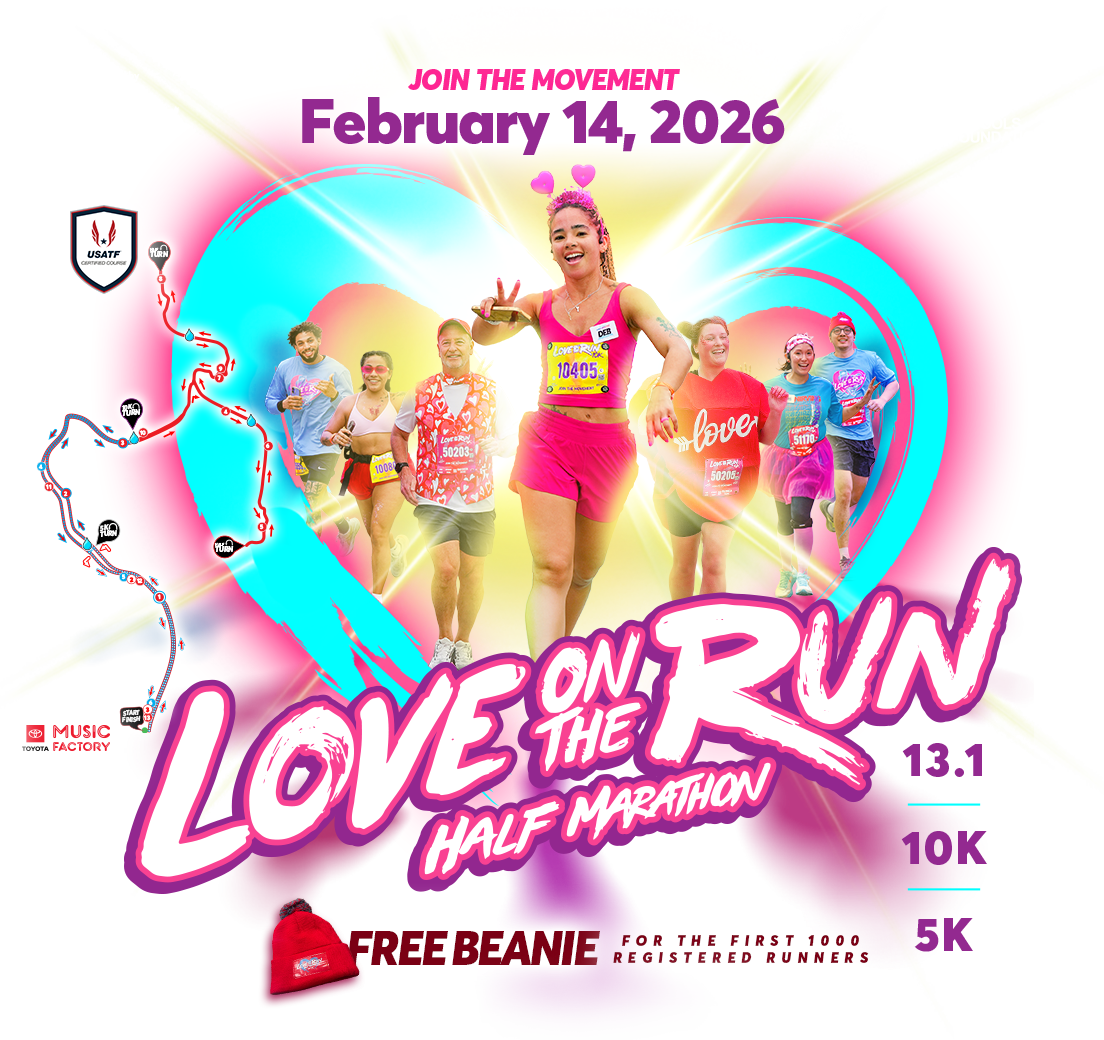 Calling all couples, singles, families, and friends! Get started on your New Year’s Resolution with this year's first run. Come celebrate and be part of the Valentine's Day Weekend North Texas Running Tradition! The Love on the Run Half Marathon includes a Half Marathon, 10k, and 5k run/walk. Centrally located in Dallas-Fort Worth, minutes from the DFW airport, the Love on the Run Half Marathon is the perfect event to join your friends and family in February, with lots of perks for everyone!
