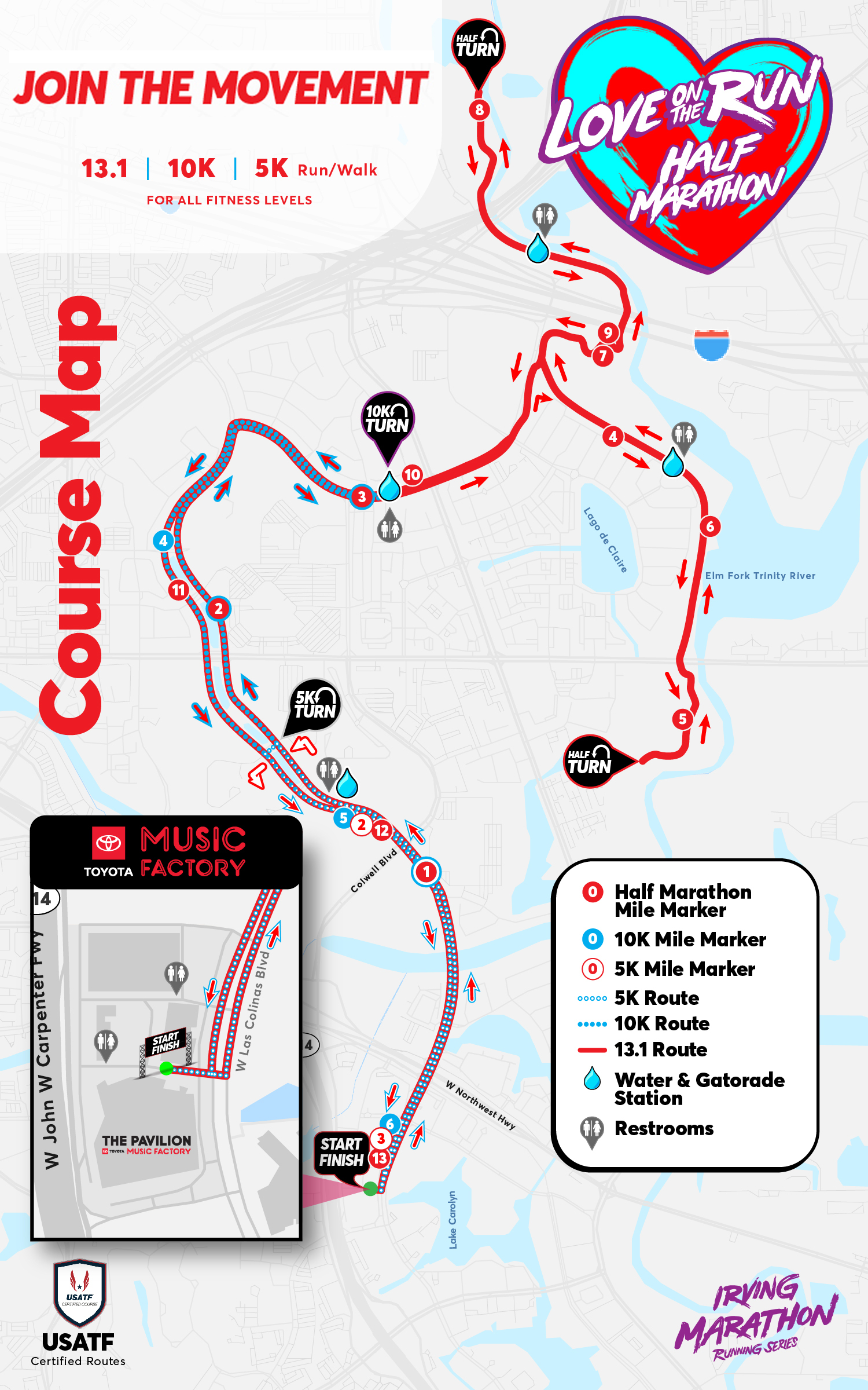 You’ll love this fast and flat route up Las Colinas Blvd and Campion Trail. Then, race back down to cross the finish line and enjoy the post-race party at Toyota Music Factory, America’s #1 concert venue.