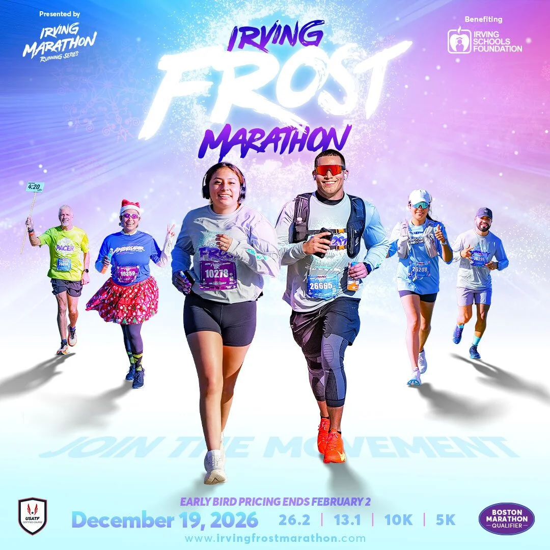 Our signature races—The Irving Marathon (Spring) and The Irving Frost Marathon (Winter)—are beloved for their flat, fast, and scenic courses, making them ideal for setting new records or qualifying for Boston.